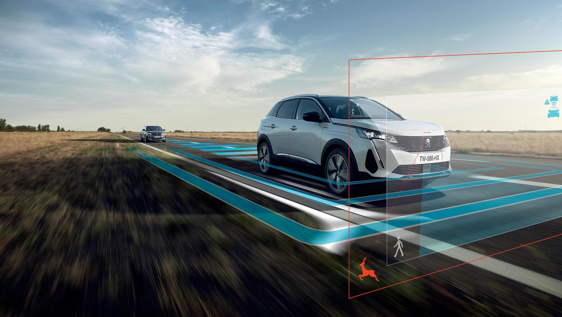 Met geavanceerde rijhulpsystemen als adaptieve cruise control met Stop&Go-functie, actieve dodehoekbewaking en nachtzicht met persoonsherkenning maakt de Peugeot 3008 semi-autonoom rijden mogelijk.