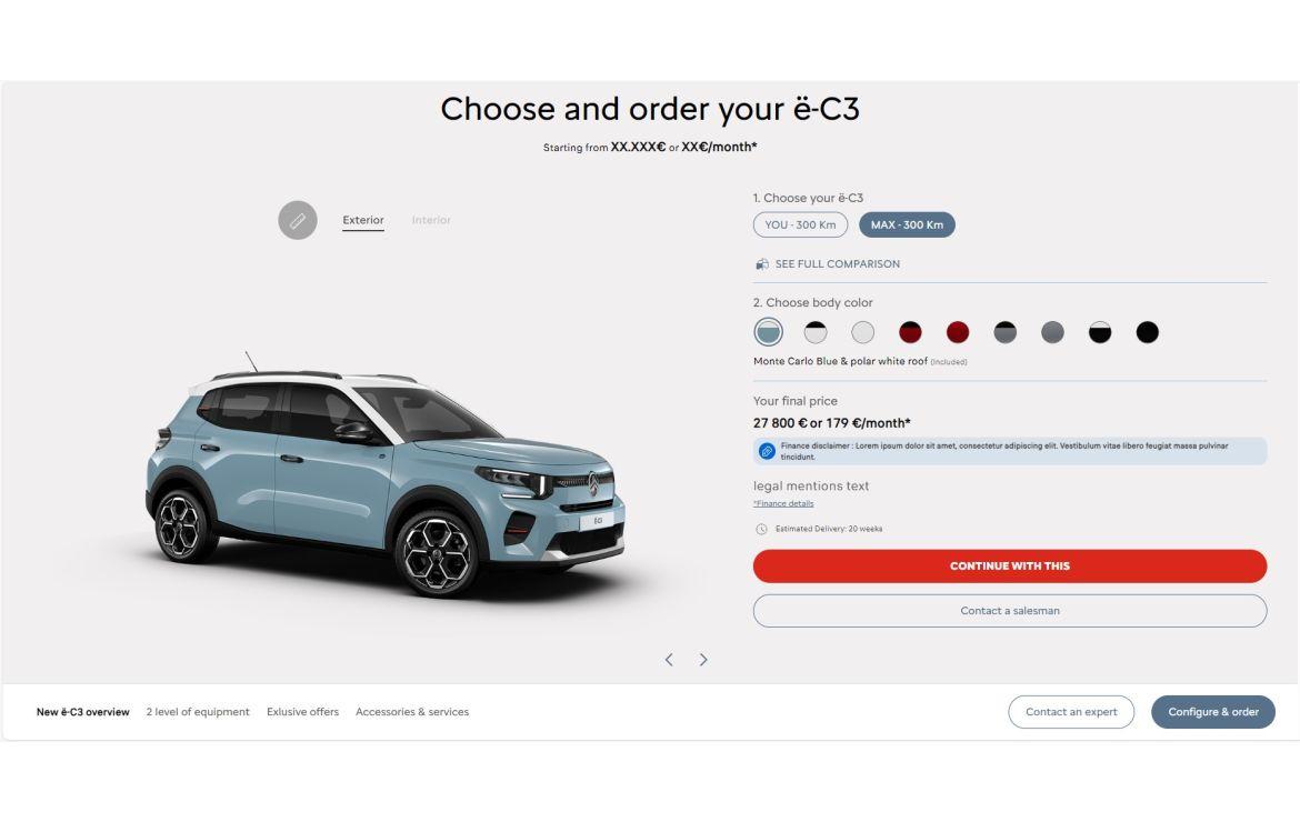 Ter gelegenheid van de opening van bestellingen van de Nieuwe ë-C3 op de meeste Europese markten introduceert Citroën een nieuwe klantervaring op zijn website. Met als doel het klanttraject te vereenvoudigen, is de website-architectuur opnieuw ontworpen om alles op één pagina te consolideren in plaats van op vier, waardoor toegang wordt geboden tot alle elementen die verband houden met ë-C3. Van het zoeken naar informatie tot het kopen: de klant kan nu alles vinden wat hij nodig heeft zonder van de ene pagina naar de andere te hoeven navigeren of eindeloos door pagina’s te hoeven scrollen. De tijd die word besteed aan het kiezen van een auto is praktisch met 50% verminderd.