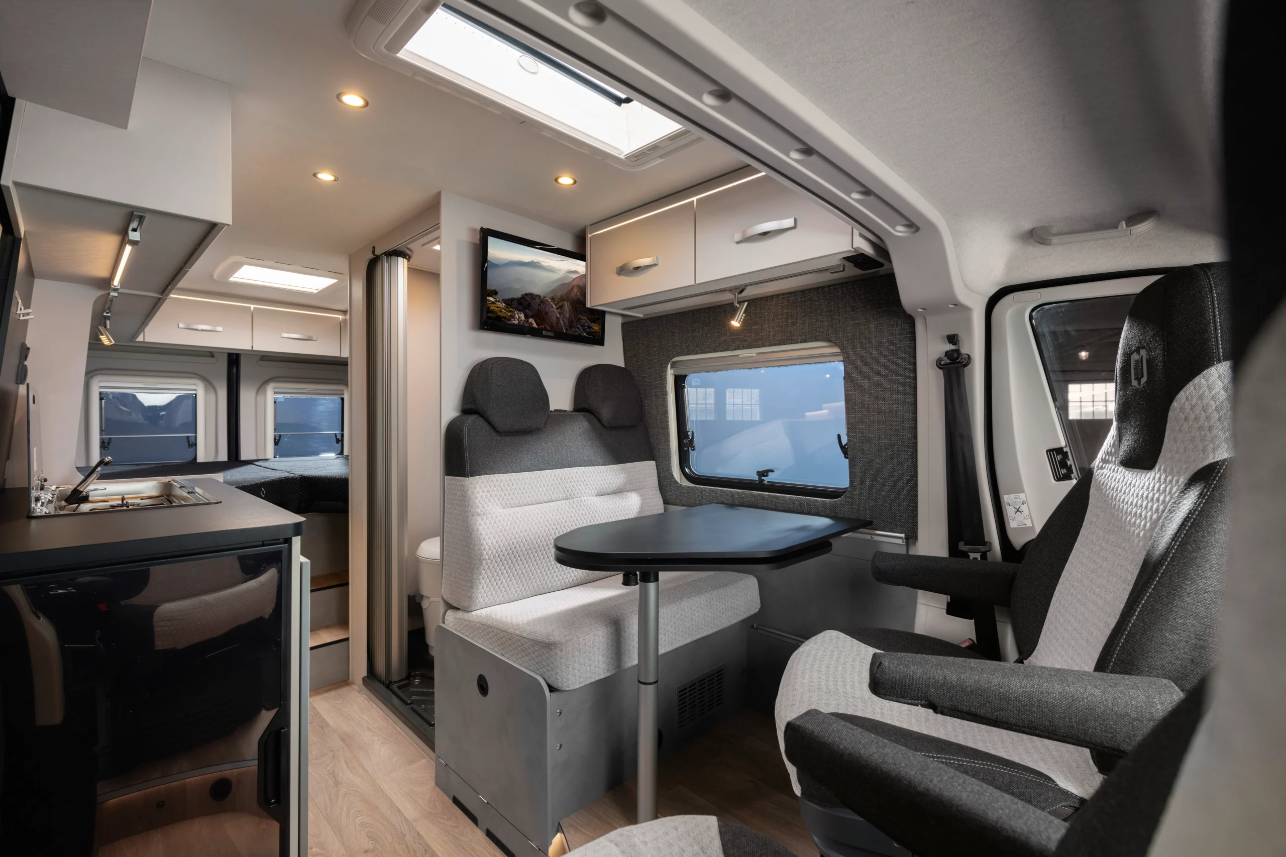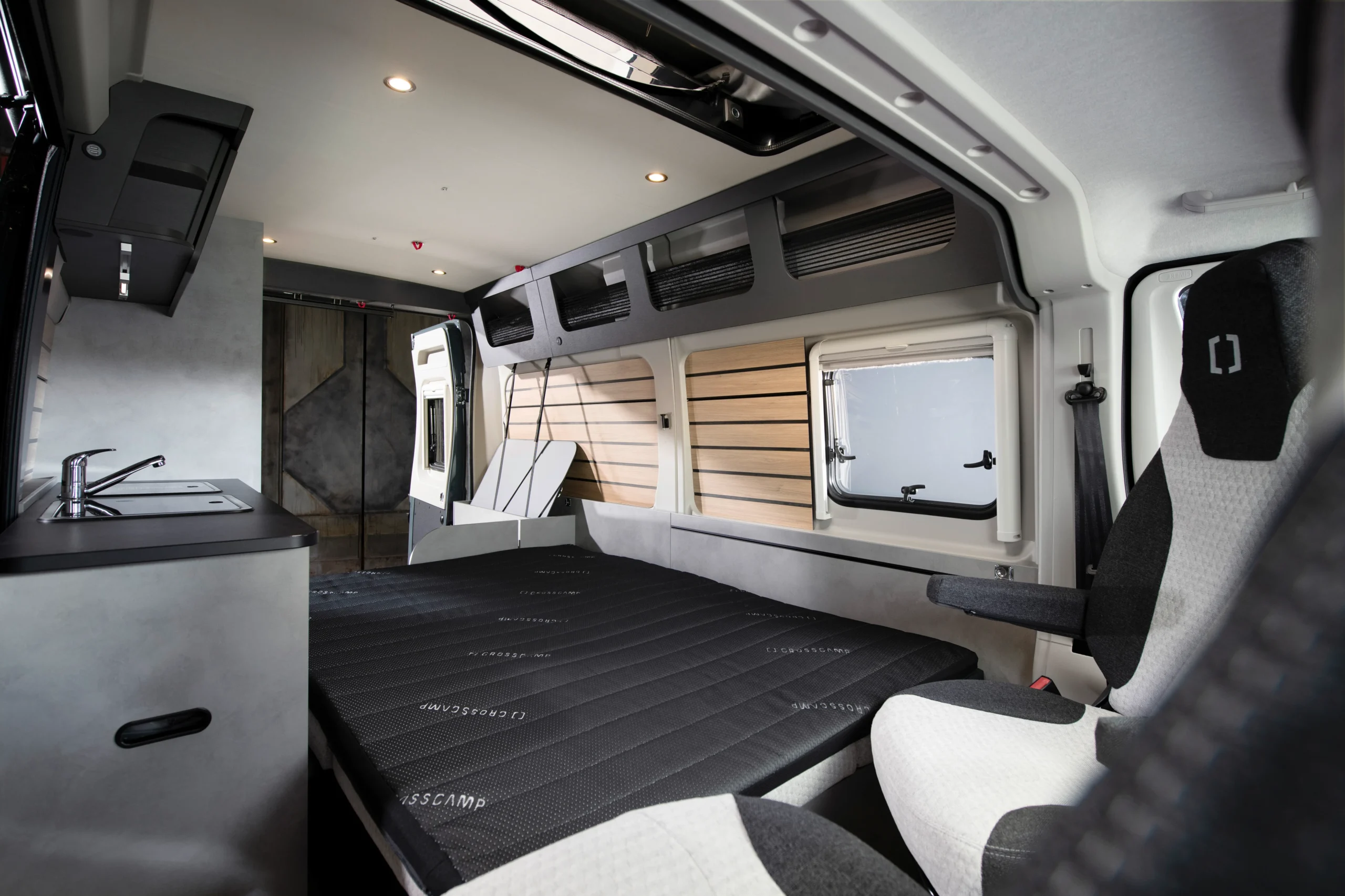 Voorin kunnen de bestuurder en voorpassagier genieten van comfortabele draaibare kapiteinsstoelen met armleuningen. Vier open dakbergingen bieden plaats aan klein keukengerei. Wandbekleding in houtdecor zorgt voor een huiselijke sfeer. In het woongedeelte van de Crosscamp 541 worden innovatieve oplossingen gebruikt: in plaats van een vast geïnstalleerd bed bevindt zich een grote slaapbank achter de bestuurder, die in slechts een paar stappen kan worden opgeklapt en ruimtebesparend aan de zijwand kan worden bevestigd. Het kan ook volledig worden verwijderd. Uitgeschoven belooft een tweepersoonsbed van 1,88 bij 1,33 meter een uitstekende nachtrust. Een dubbele rail in de vloer onder de slaapbank, waarin twee optionele stoelen veilig kunnen worden bevestigd, zorgt voor nog meer flexibiliteit. Wanneer ze niet in gebruik zijn, kunnen ze worden opgeklapt en onder de slaapbank worden opgeborgen. Een multifunctionele tafel die ook buiten gebruikt kan worden, maakt het geheel compleet.