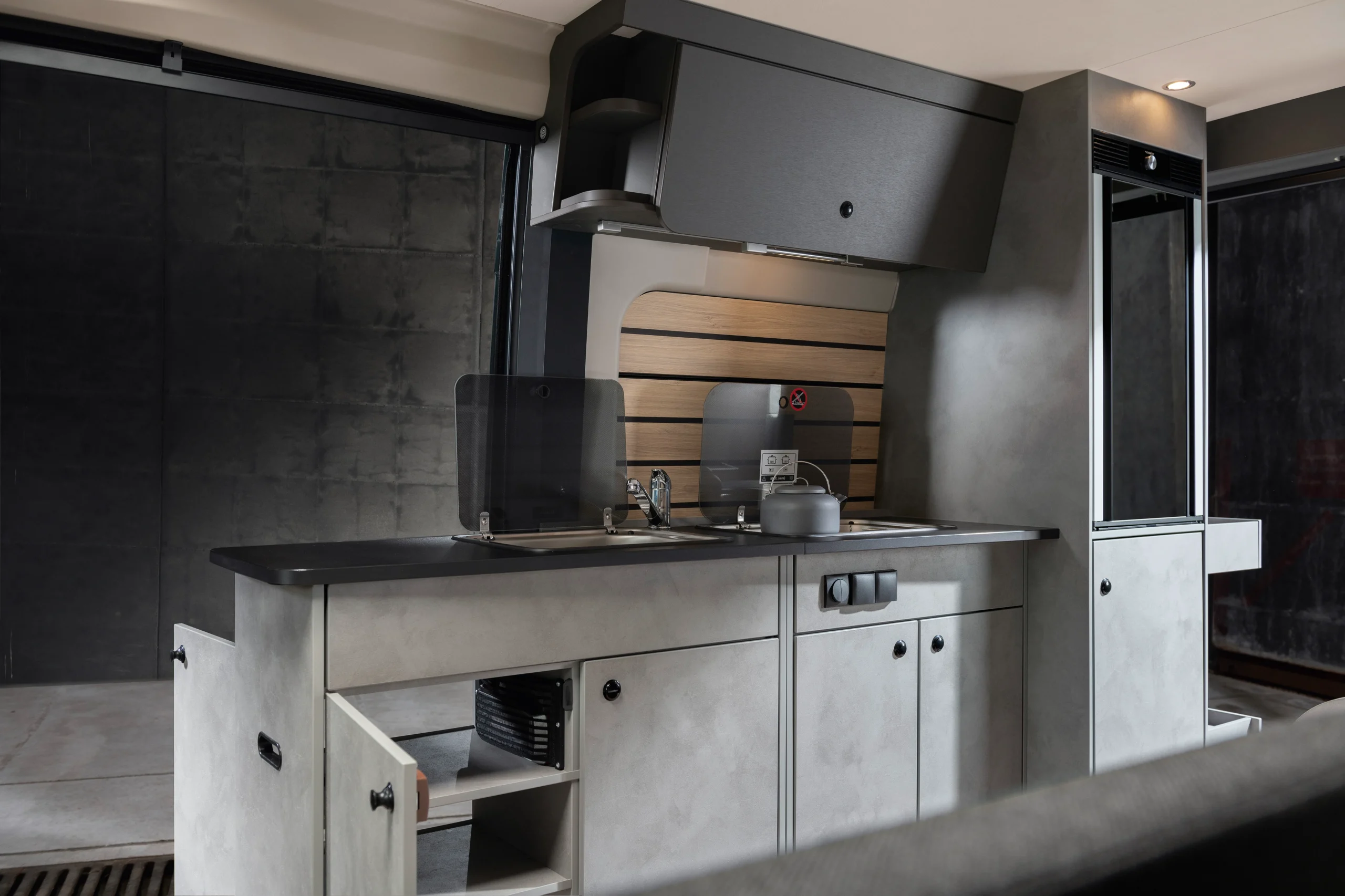 Het functionele keukenblok heeft een driepits gasfornuis, een spoelbak met geïntegreerde kraan en een koelkast van 84 liter met vriesvak, waarvan de deur naar de ingang opent, waardoor toegang van binnen en van buiten gemakkelijk mogelijk is. Grote, greeploze lades onder de spoelbak en opberg- en werkbladen bieden veel ruimte tijdens het koken. De compacte, volledig uitgeruste badkamer belooft ook comfort. De rolgordijndeur zorgt voor een ruimtebesparende toegang, terwijl de uittrekbare kraan ook als veelzijdige buitendouche kan worden gebruikt. Boven- en onderkasten bieden veel opbergruimte voor keukengerei; De spiegel in de bovenkast kan ook opzij worden geschoven. Een zijraam en een dakraam zorgen niet alleen voor veel daglicht, maar ook voor een goede ventilatie.